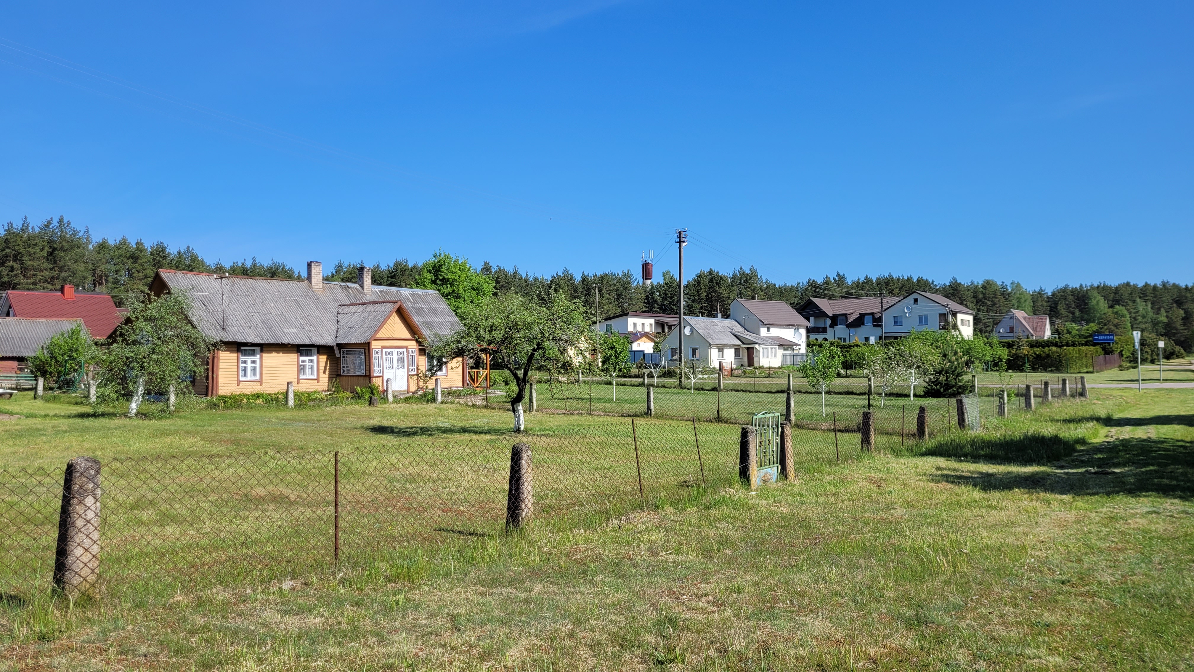 Kurz vor Labanoras treffe ich wieder auf Asphalt, gleichzeitig knüpft meine Erinnerung an meinen letzten Trip hierher an. Ich war im Februar 2022 schonmal hier, damals tief verschneit und mit Temperaturen weit unter Null. Jetzt laufe ich die blühende Dorfstraße entlang, die damals von hohen Schneewällen gesäumt war. Im winzigen Dorfladen kaufe ich ein paar Getränke. Weiter hinten im Dorf gibt es ein ebenso winziges Hotel in einem charmanten Holzhaus, ich habe heute Nacht also wieder ein Dach über dem Kopf. Das Restaurant hat zwar geschlossen, aber das wusste ich vorher.